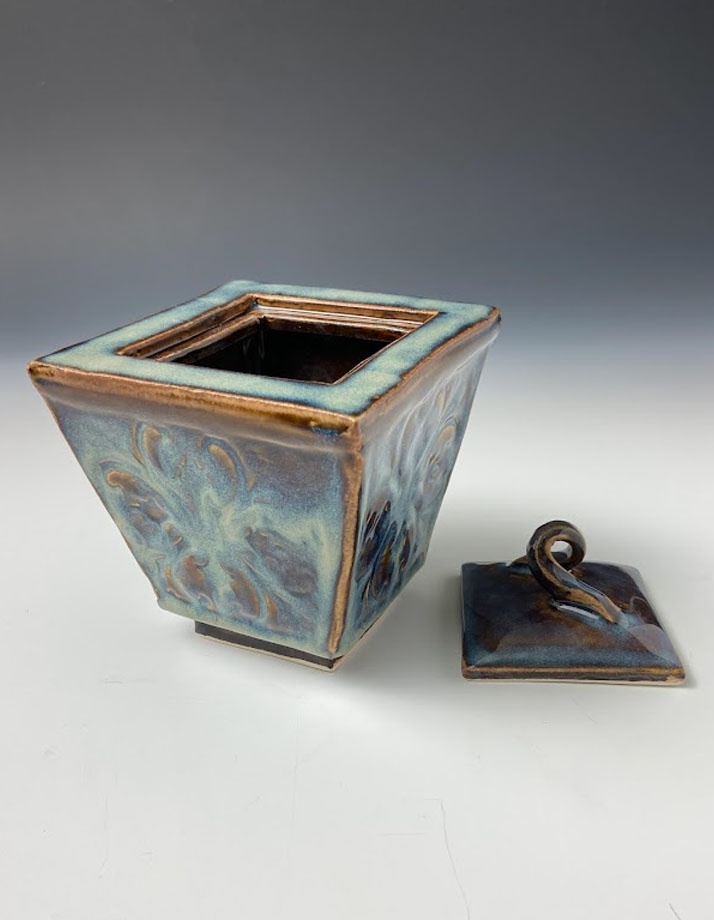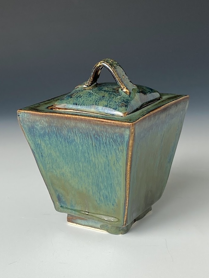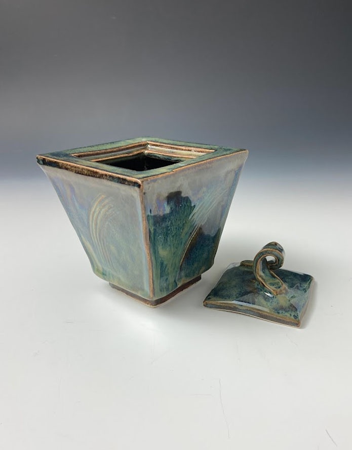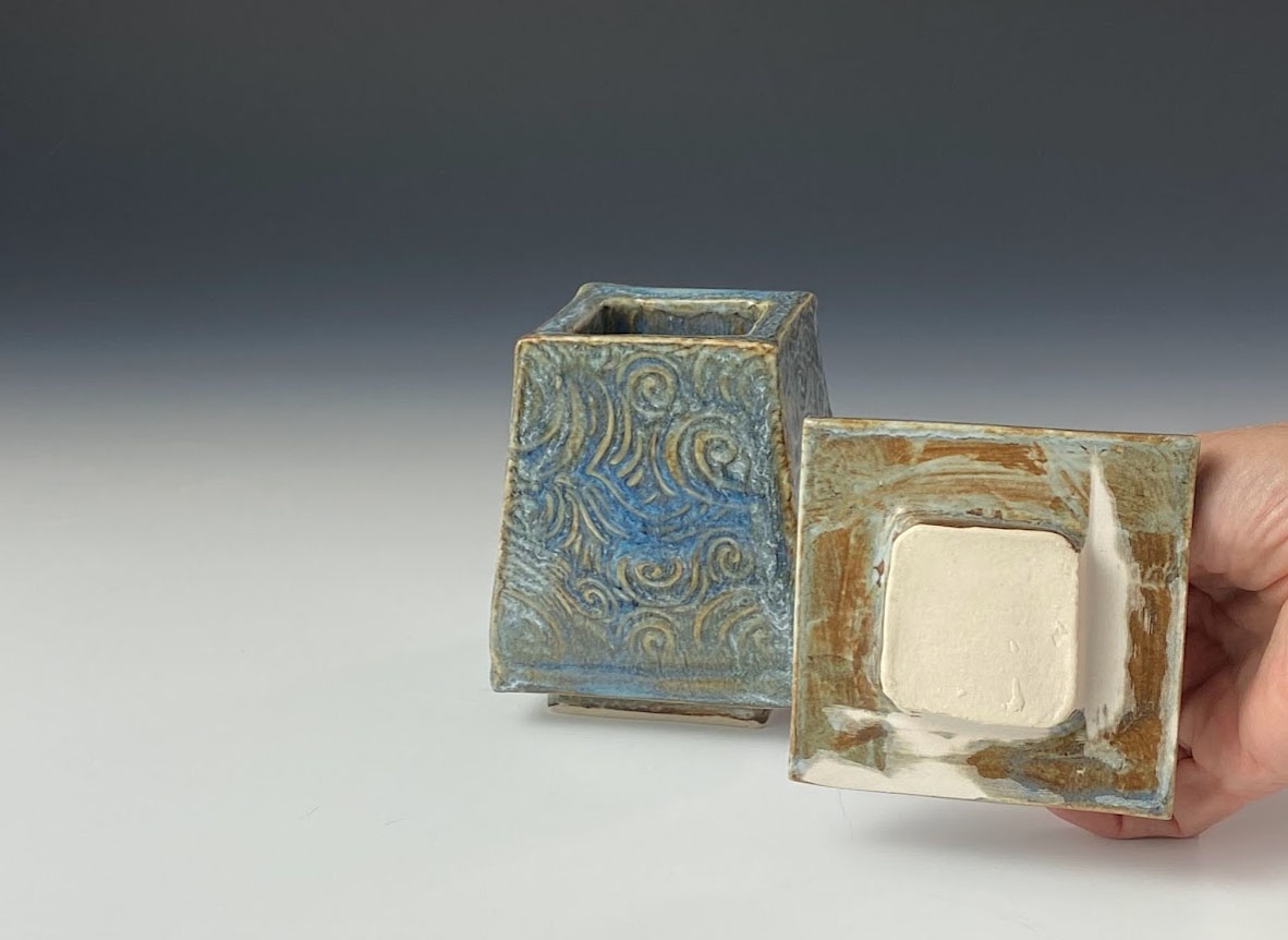 These one-of-a-kind hand sculpted boxes are made from leather hard, slab, stoneware clay and crafted with sleek lines with a classic, contemporary feel. It's fired once, hand-glazed and fired again.