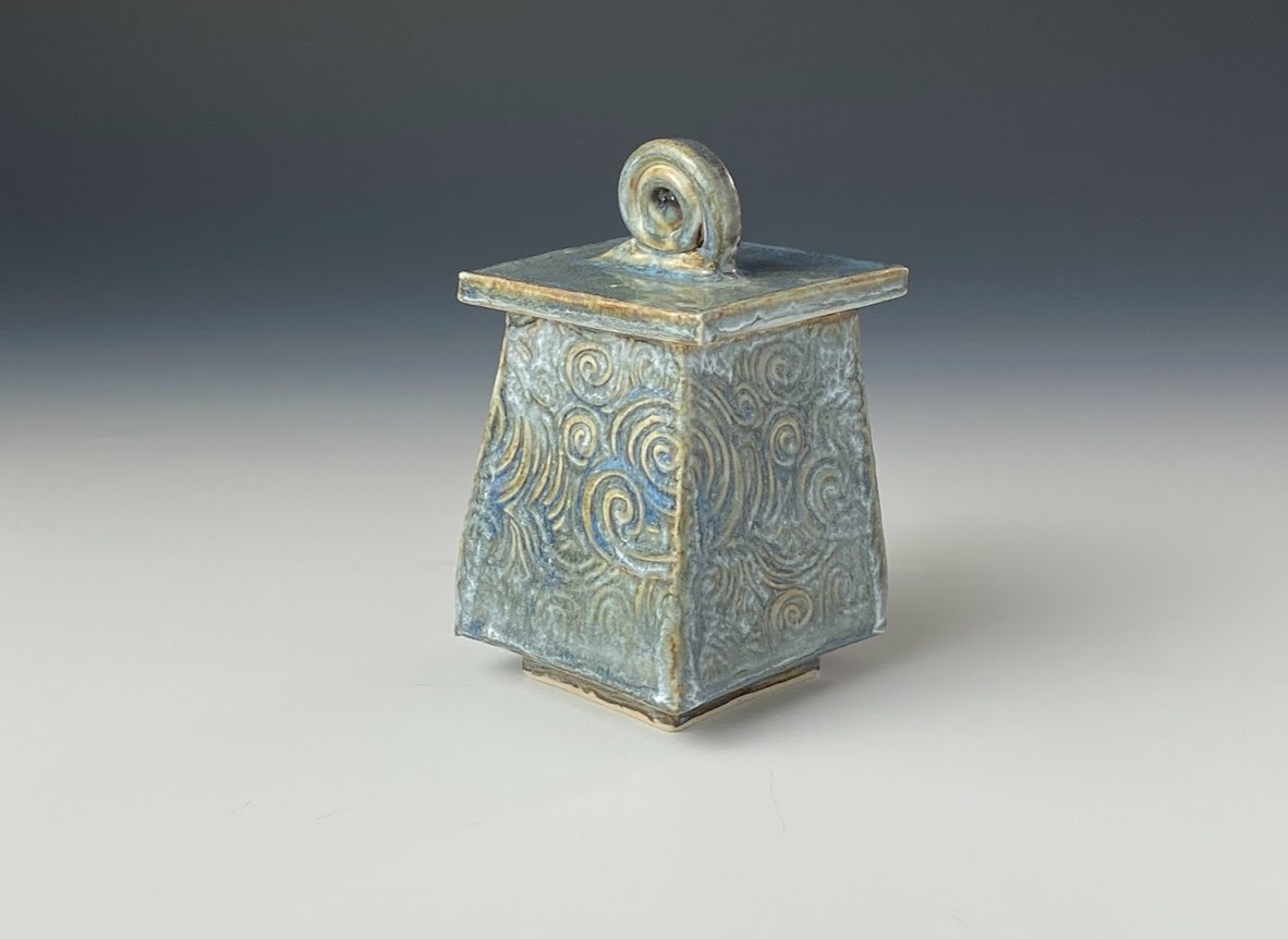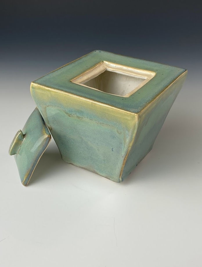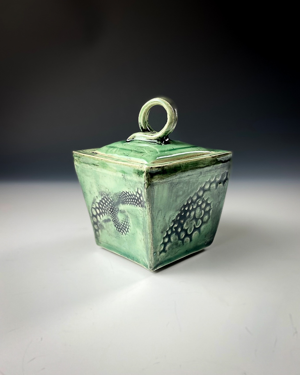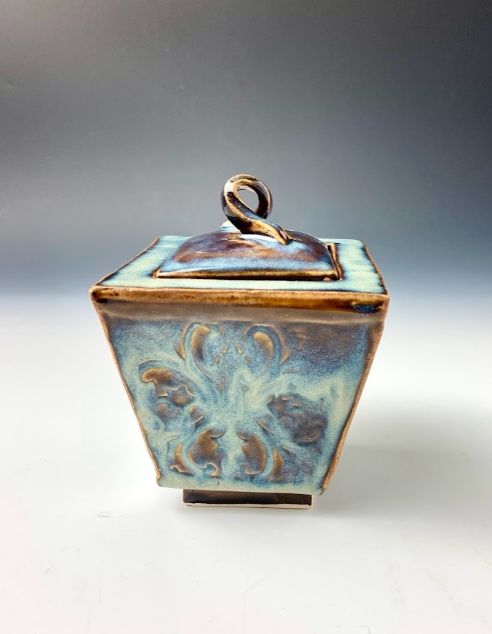 These one-of-a-kind hand sculpted boxes are made from leather hard, slab, stoneware clay and crafted with sleek lines with a classic, contemporary feel. It's fired once, hand-glazed and fired again.
