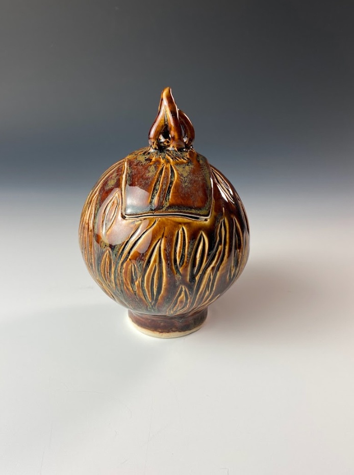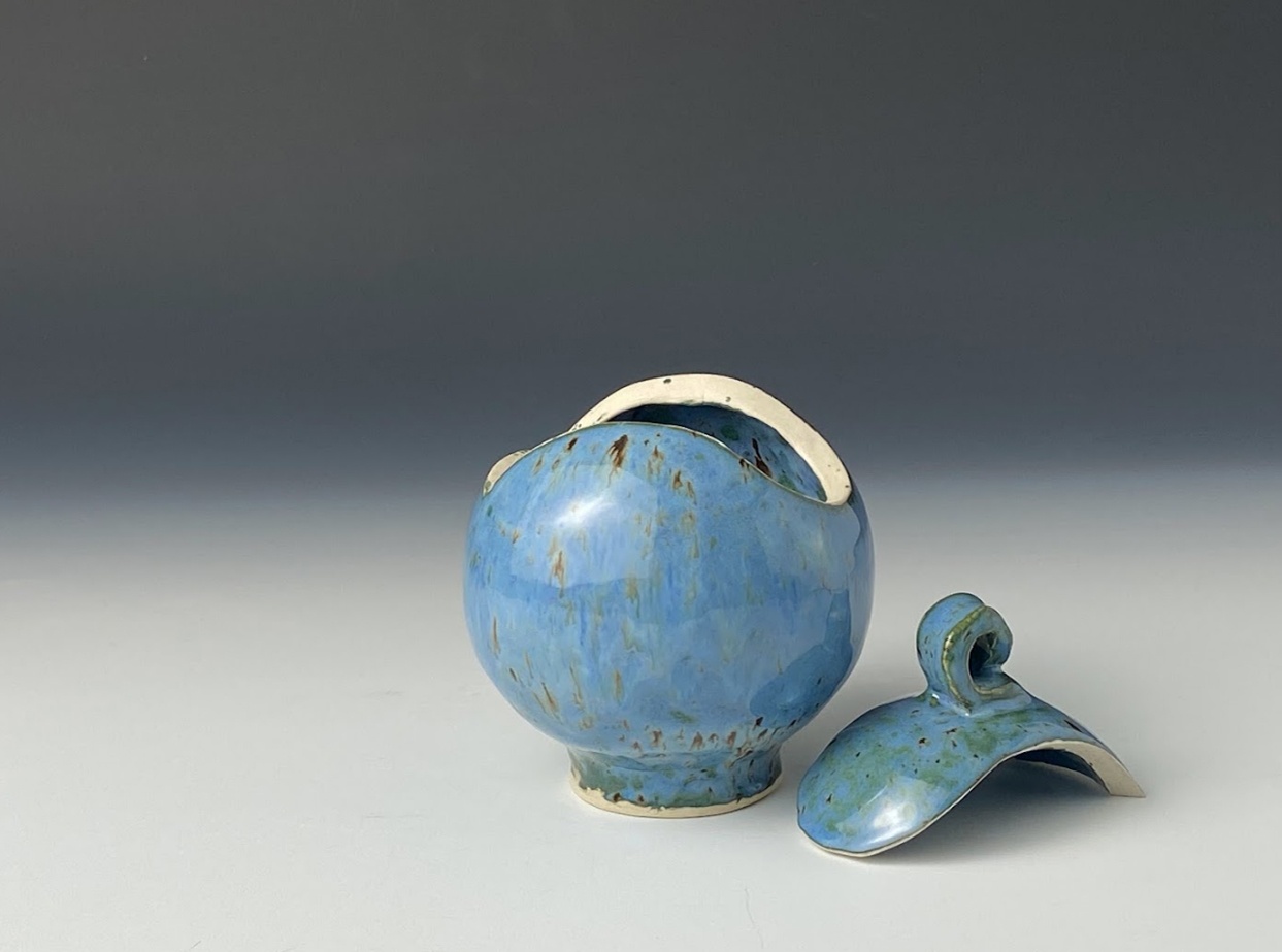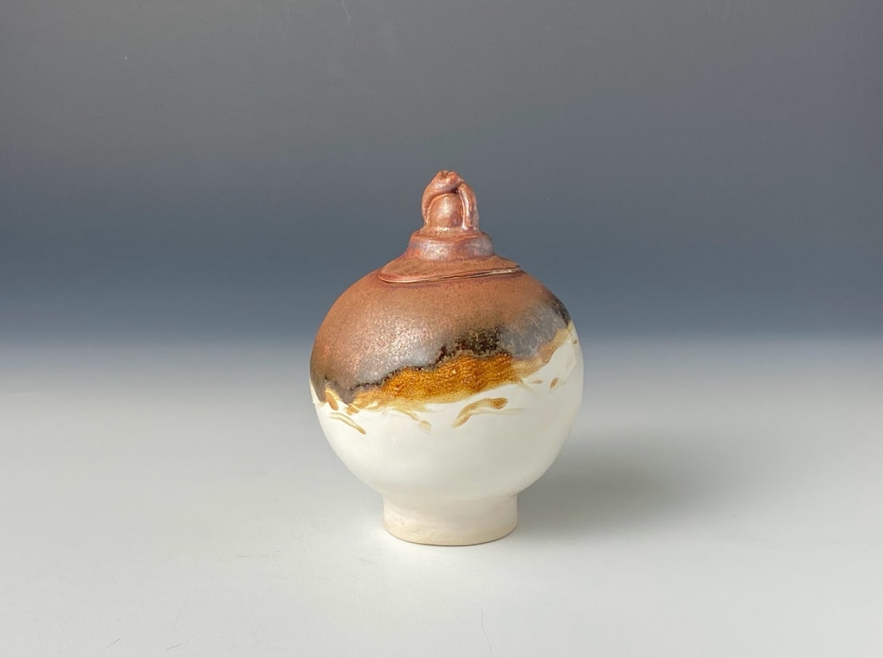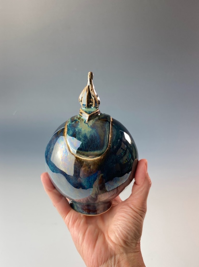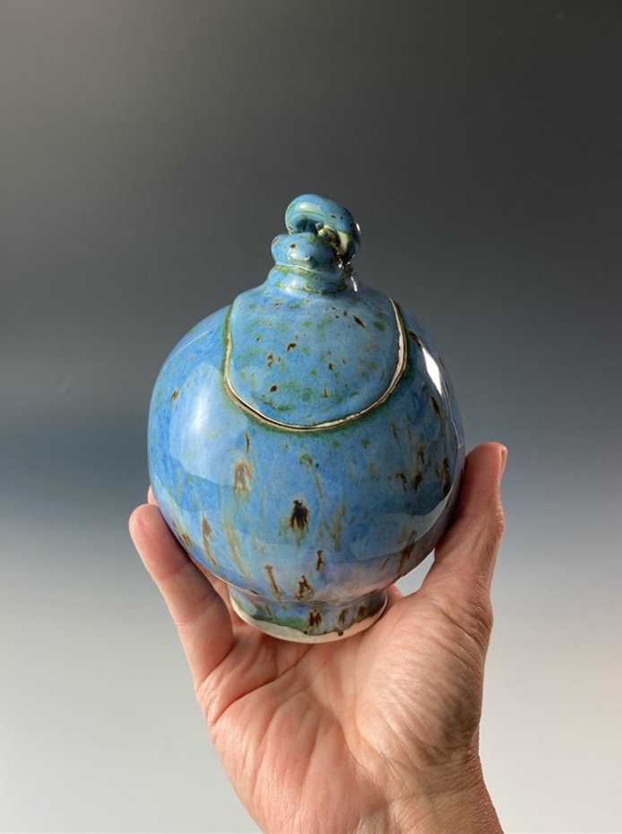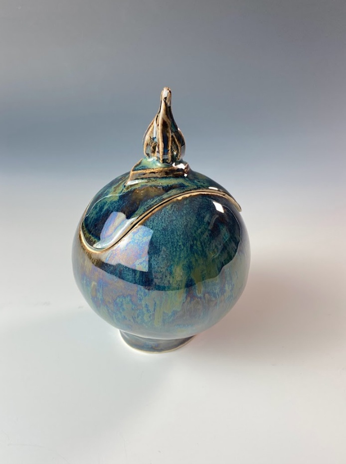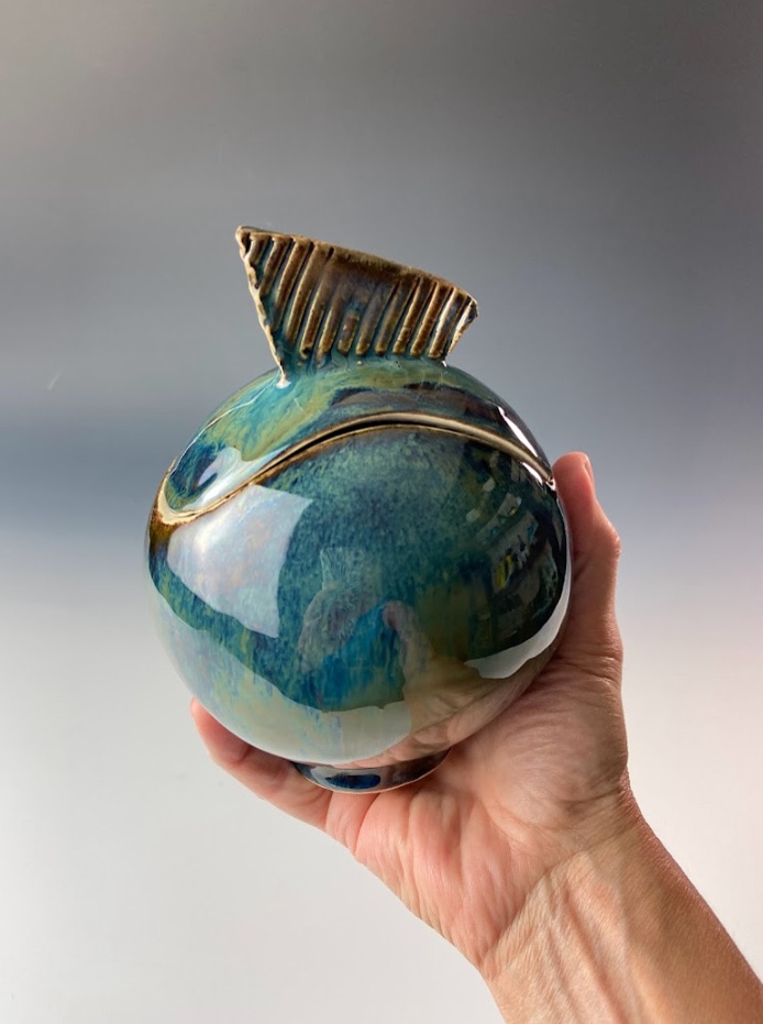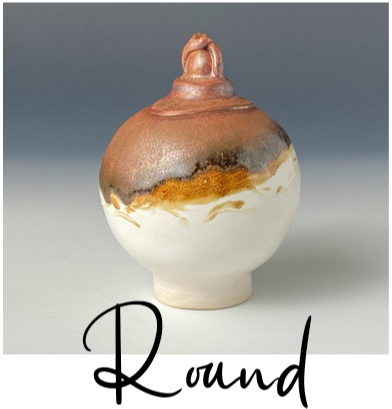 These beautiful vessels are each handmade, one-of-a-kind ceramic arts, made from one white stoneware slab of clay and sculpted into an orb. It's fired once, hand-glazed and fired again.